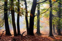 Prachtige opname van het silhouet van de bomen in het Grebbebos op de Grebbeberg bij Wageningen en Rhenen met groene, gele en oranje bladeren tijdens zonsopkomst in de herfst