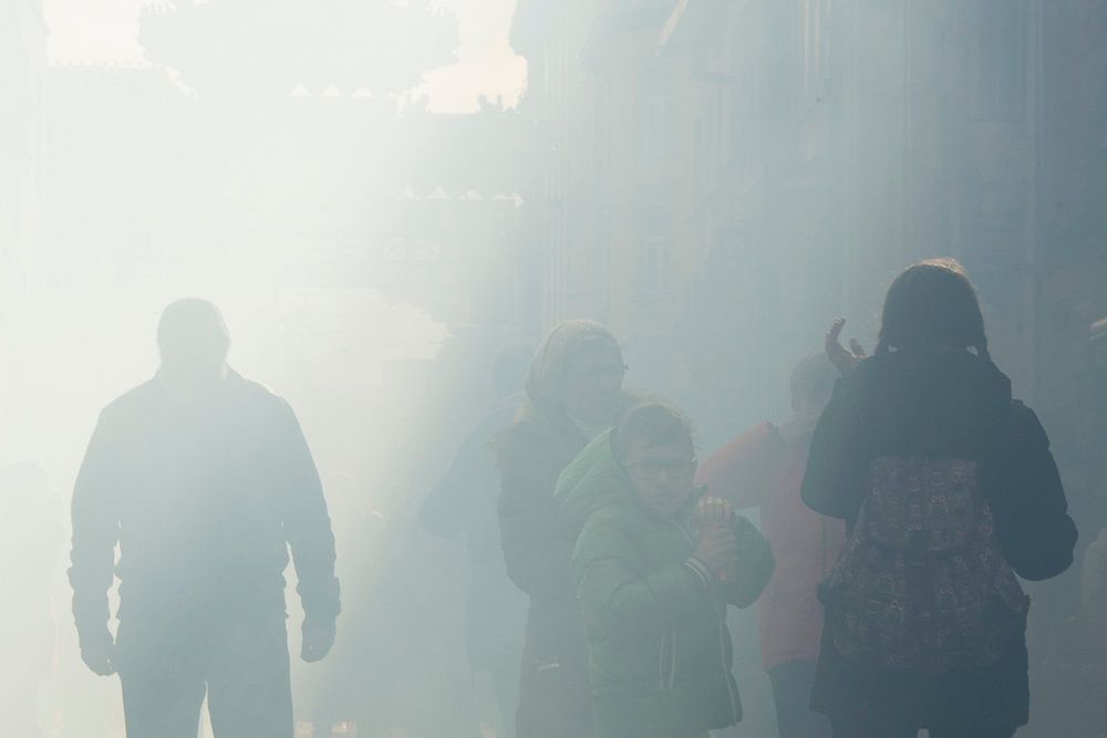 Viering van Chinees Nieuwjaar in Antwerpen. Door het vele vuurwerk hing de straat vol nevel.