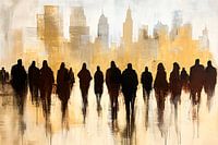 Deze moderne wanddecoratie toont een unieke combinatie van schaduwrijke silhouetten tegen een stedelijke skyline. De warme goud- en bruintinten creëren een intrigerend contrast met de donkere schaduwen en geven een dynamisch en toch serene uitstraling. Perfect voor een woonkamer of kantoorruimte, biedt dit ontwerp een eigentijdse sfeer met een vleugje abstractie. Het is een geweldige keuze voor liefhebbers van stedelijke kunst en moderne interieurs.