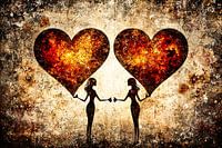 Dit prachtige ontwerp combineert de kracht van liefde en elegantie in een uniek en artistiek beeld. Twee silhouetten houden elk een groot, vurige hart vast, wat een gevoel van verbinding en passie overbrengt. De warme rood- en oranjekleuren worden prachtig in evenwicht gehouden door de donkere silhouetten en de abstracte, verweerde achtergrond. Deze wanddecoratie is perfect om een ruimte een romantische en dynamische uitstraling te geven. Ideaal voor slaapkamers, woonkamers of zelfs gangen. Laat je inspireren door de tijdloze schoonheid en intense emoties die dit kunstwerk oproept.