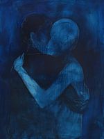 Dit krachtige, rustgevende, intieme kunstwerk vangt een moment van intieme omhelzing, volledig gehuld in de diepe en mysterieuze tonen van indigo.