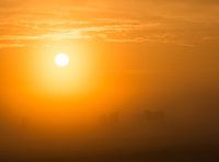Een mistige zonsopkomst in het polderlandschap van de Alblasserwaard. In de mist de maar net zichtbare silhouetten van enkele grazende koeien, Hollandser kan het bijna niet.