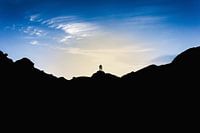 Silhouetten van twee mensen die op de top van een berg staan bij zonsondergang. Wout Kok One2expose
