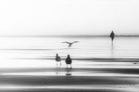 Een eenzame wandelaar op het strand van Oostende , zijn enige metgezellen de meeuwen op het strand.