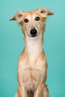 Portret van een silken windsprite een langharige whippet tegen een turquoise blauwe achtergrond