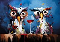 Portret van twee kleurrijke (en lichtelijk aangeschoten:) uilen aan de bar in een café.