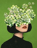 Het geschilderde portret van een vrouw, met vetplanten in heur haar.