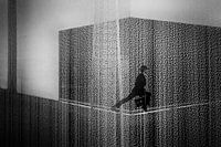 Dit is een combinatie van 2 foto's. Een glazen tuinafzetting gecombineerd met een detailopname van de Silly Walk van John Clees. Een afbeelding in de Dommeltunnel in Eindhoven