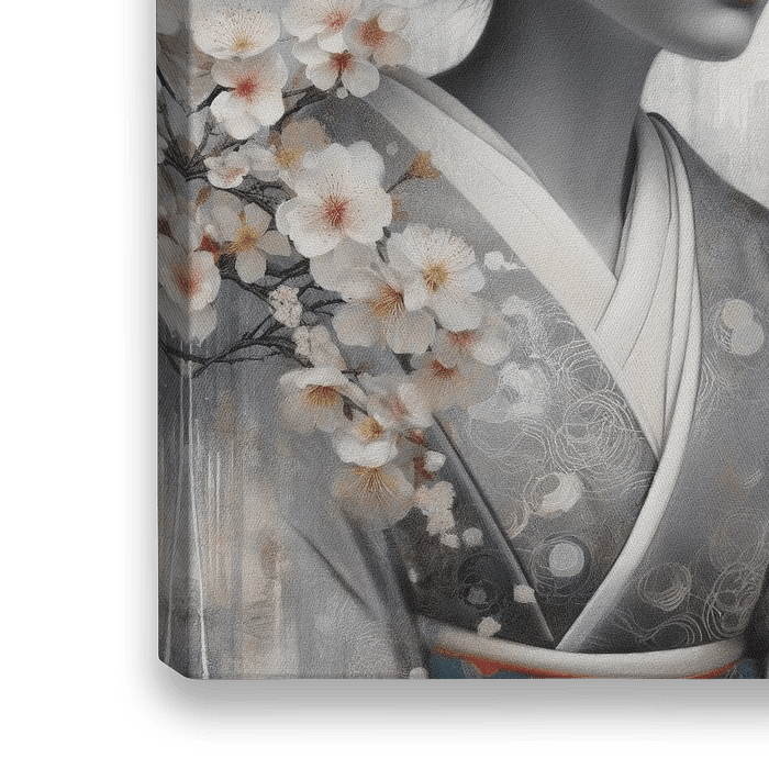 Portret van een Japanse geisha, in voornamelijk zilverkleurige kleuren.