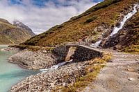 Prachtige herfstkleuren langs het wandelpad van het Silvretta stuwmeer in het Montafon gebied van de Oostenrijkse Alpen.