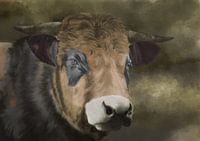 Dierenillustratie, portret van een Simmenthaler of Vleckvieh stier. Klassieke weergave met aandacht voor realisme en sfeer. een indrukwekkend beeld voor aan de muur. Het straalt rust en vertrouwen uit, wars van mode, een tijdloos beeld.