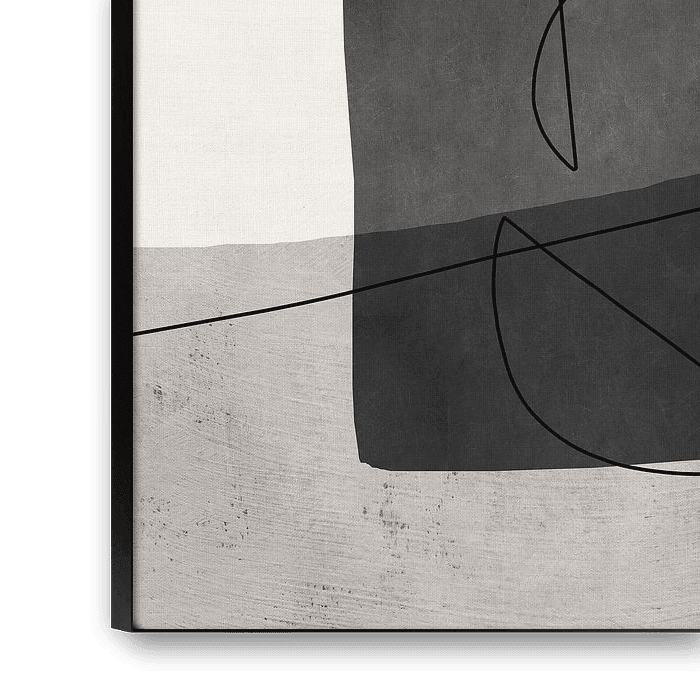 Minimalistische zwart-wit compositie op beige-groene achtergrond met lichte textuur. Fijne witte en zwarte lijnen doorkruisen het beeld om de abstracte vormen met elkaar te verbinden en het kunstwerk losser te maken.