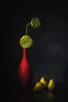 Eenvoudig ,Zen stilleven met rode vaas peren en lotus harten . Makkelijk inpasbaar in de ruimte door zijn eenvoud Ook geschikt als poster en behang.