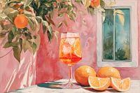Een digitale illustratie van een zomerse setting met een verleidelijke Aperol Spritz, omringd door verse sinaasappels en een citrustak met fruit. De roze achtergrond en turquoise raampartij creëren een warme mediterrane sfeer, terwijl het spel van licht en schaduw een romantische dimensie toevoegt aan het geheel.