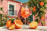 Een zonnige mediterrane compositie waar een verfrissende oranje cocktail in een elegant wijnglas centraal staat, omringd door sappige sinaasappels tegen een karakteristieke roze zuidelijke villa-gevel met turquoise luiken. De combinatie van rijpe citrusvruchten aan de boom en op tafel, samen met de sprankelende aperitief, roept direct het gevoel van een zorgeloze zomerse middag op.