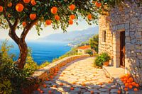 Een zonovergoten pad slingert door een pittoreske boomgaard waar sappig, oranjekleurig fruit de takken van een oude boom siert. De zachte golven van de zee schitteren op de achtergrond, terwijl een charmant stenen huis rust en geborgenheid uitstraalt. Hier komen natuur en architectuur in perfecte harmonie samen en nodigen je uit om te blijven hangen.