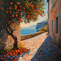Een smal, zonovergoten pad baant zich een weg tussen stenen muren, terwijl gouden sinaasappels uit de weelderige bomen vallen en de grond sieren met heldere kleurspatten. Het uitzicht reikt over de glinsterende zee die zachtjes langs de kust strijkt, en nodigt je uit om weg te dromen in een mediterrane idylle.