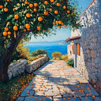 In een zonovergoten landschap met fel oranje torenspitsen slingert een pittoresk geplaveid pad zachtjes naar de glinsterende zee. Een bloeiende boom, zwaar beladen met sappig fruit, biedt schaduw en een verleidelijk uitzicht op het turquoise water, terwijl de charmante stenen muur het karakter van deze idyllische omgeving benadrukt.