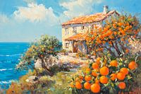 Een pittoresk huis schittert in een magische omgeving aan de kust, omringd door fel oranje gekleurde sinaasappelbomen. De zachte wind verspreidt de zilte geur van de zee terwijl de golven zachtjes tegen de rotsen slaan. Dit levendige samenspel van kleuren en natuur belooft een idyllisch toevluchtsoord waar tijd en ruimte in harmonie samenleven.
