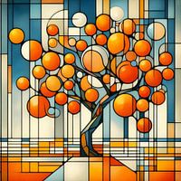 Illustratie van een sinaasappelboompje gemaakt door A. I. Artificial Intelligent in de stijl van Mondriaan.. Er zijn 4 verschillende voorstellingen , leuk om als tegeltjes naast elkaar te hangen in de keuken. Maar het is zeker ook leuk om er één apart in het groot op te hangen als een echte eye catcher.