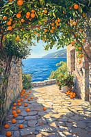 Een schilderachtig pad baant zich een weg tussen warme stenen muren, terwijl sappige sinaasappels oplichten in het tegenlicht en de zintuigen prikkelen. Boven het zachte kabbelen van het water is het uitzicht gericht op de glinsterende zee terwijl de zon door het bladerdak danst. Dit harmonieuze landschap belooft onvergetelijke momenten en nodigt je uit om te blijven hangen.