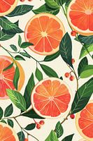 Deze levendige illustratie van sappige grapefruits en groene bladeren brengt frisheid en energie in elke keuken. De moderne, grafische elementen en felle kleuren maken dit kunstwerk tot een vrolijke blikvanger, ideaal voor liefhebbers van fruitmotieven en eigentijdse illustraties. Perfect om keukens, eetkamers of ontbijthoeken op te fleuren en een fruitige sfeer te creëren.