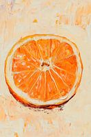 De sinaasappelkleurige vrucht is levendig en sappig en straalt warmte en frisheid uit. De fijne details van de getextureerde schil en de sappige partjes wekken de indruk van een uitnodigende smaak. Dit kunstwerk is perfect voor in de keuken, waar het de zintuigen prikkelt en levensvreugde uitstraalt.