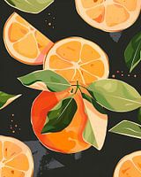 Deze illustratie is krachtig en opvallend met zijn donkere achtergrond die de heldere, levendige kleuren van de sinaasappelschijven en de volledige vruchten naar voren brengt.