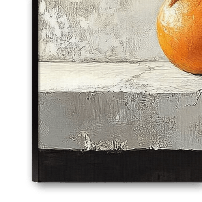 Sinasappelen | Timeless Orange Serenity - Dit stilleven schilderij toont een rustgevende compositie van sinasappelen, waarvan één doorgesneden, naast verweerde aardewerk vessels op een lichtgekleurde, textuurrijke achtergrond die een gevoel van tijdloosheid uitstraalt.