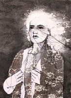 Een figuratief zwart-wit schilderij van verschillende materialen. De zwarte draden geven emotie en beweging weer.