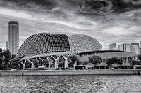 Contrastvolle zwart-wit opname van het iconische Esplanade – Theatres on the Bay in Singapore, ook wel bekend als "de durian" vanwege zijn stekelige dakconstructie. De moderne architectuur contrasteert fraai met het zachte blauw van de lucht en het rustige water van Marina Bay. Een beeld dat de unieke stadsarchitectuur van Singapore op artistieke wijze vangt.
