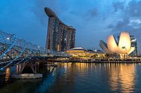 Marina Bay Sands Hotel en ArtScience Museum bij zonsondergang, Singapore, Azië