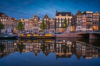 Een foto gemaakt aan het Singel te Amsterdam. Aan de singelgracht in de hoofdstad van Nederland vind je deze prachtige grachtenpanden. Het singel ligt gelegen in de oude centrum, in de binnenstad van Amsterdam. De foto is tijdens het blauwe uur gemaakt met weinig wind, dit zorgde voor een mooie reflectie in de gracht.