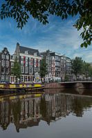 De Singel is gerekend vanaf het Centraal station, de eerste van de serie grachten in Amsterdam. Dit beeld toont een mooi gedeelte van de Singel. We zien over het water heen een paar fraaie grachtenpanden. In het water ligt een geel en zwart gekleurde woonboot. De grachtenpanden weerspiegelen in het water. Het beeld wordt gecompleteerd door de blauwe lucht en de overhangende boomtak met groene bladeren.