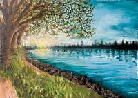 De zon komt op aan de adriaan volkersingel in Sliedrecht, Zuid Holland, Nederland. Het is vroeg in de ochtend en de goud gele zon schittert over rivier de Merwede. De bomen en struiken aan de overkant zijn nog in een donker silhouet gehuld , en de donkerblauwe lucht wordt langzaam verlicht. De stralen van de zon bereiken de bladeren, bomen, het gras en de rotsen liggend aan het water. De lente komt eraan. Dit schilderij is origineel geschilderd met acrylverf op canvas. Mooie landschap kunst voor jouw als liefhebber van schilderkunst of natuur, en zeker een aanwinst voor Sliedrechtse kunst liefhebbers.
