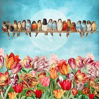 Deze illustratie is een collage van afbeeldingen en toont een charmante rij van diverse zangvogels die zij aan zij op een tak rusten. De onderste helft van het beeld wordt gesierd door een weelderige bloemenzee in vele kleuren,…