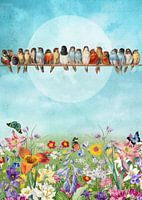 Deze illustratie is een collage van afbeeldingen en toont een charmante rij van diverse zangvogels die zij aan zij op een tak rusten. De onderste helft van het beeld wordt gesierd door een weelderige bloemenzee in tinten van purper, geel en…