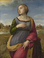 Rafaël heeft zich geconcentreerd op het visionaire aspect van het geloof van de heilige, door haar vast te leggen met haar hand op het hart en haar lippen gespreid, in een moment van goddelijke extase naar de hemel kijkend naar een gouden breuk in de wolken. Op de voorgrond staat een zaadhoofdje van een paardenbloem. De paardenbloem komt vaak voor in Nederlandse en Duitse schilderijen als symbool van christelijke rouw en de Passie (de marteling en kruisiging van Christus).
