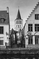 Zwart-wit foto met trapgevelhuisje aan de Langerei en zicht op de Sint-Gilliskerk.