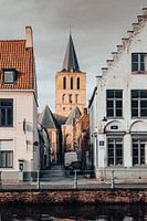 Kleurfoto met oranje-bruine tinten van trapgevelhuisje aan de Langerei en zicht op de Sint-Gilliskerk.