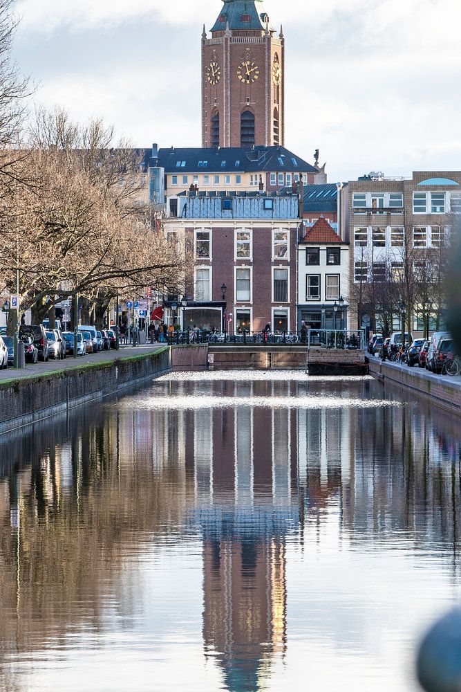 De Sint-Jacobskerk reflecteert op het rustige water van de gracht dat zich in de koninklijke stal in Den Haag nestelt.