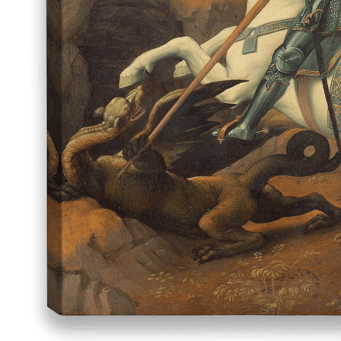 Sint Joris en de Draak, Rafaël Rafaël werd geboren in Urbino, een centraal Italiaans hertogdom dat bekend stond om zijn elegante adel en renaissancewetenschap. Eind 1504 verhuisde hij naar Florence. Sint Joris en de draak, een van de twee versies van het thema door de kunstenaar, maakte deel uit van een reeks miniatuurpanelen die Rafaël in Florence schilderde voor het beroemde hof van Urbino. Sint Joris, een Romeinse soldaat met een christelijk geloof, redde de dochter van een heidense koning door met zijn lans een draak te bedwingen; de prinses leidde de draak vervolgens naar de stad, waar de heilige hem met zijn zwaard doodde, wat de koning en zijn onderdanen ertoe aanzette zich tot het christendom te bekeren. Een bijzonder kenmerk van het schilderij is de blauwe kousenband van de heilige aan zijn gepantserde been. De inscriptie, HONI, begint met de zin Honi soit qui mal y pense (Onteerd is hij die er slecht over denkt), het motto van de ridderlijke Orde van de Kousenband, waarvan George de beschermheilige is. Hertog Guidobaldo da Montefeltro van Urbino werd in 1504 door koning Hendrik VII van Engeland tot ridder in de prestigieuze orde benoemd. Uit onderzoek is gebleken dat het paneel is gemaakt voor de gezant van de koning, Gilbert Talbot, en niet als geschenk direct voor de koning, zoals eerder werd gedacht. Rafaël was een Italiaanse kunstenaar uit de hoogrenaissance. Rafaël is de naam waaronder hij nu wereldwijd bekend is. Zijn echte naam was Raffaello Sanzio. Hij is ook bekend onder namen als Raffaello Santi en Raffaello da Urbino. Zoals bij veel kunstenaars uit de Italiaanse Renaissance,