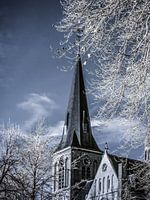 De Sint Lambertus kerk te Beers, Noord-Brabant. Deze foto is genomen met een aangepaste camera die alleen infrarood licht waarneemt. In de nabewerking is de infrarood opname teruggezet naar een kleuren opname, een zogeheten False Color, infrarood. Dat geeft licht vervreemdende kleuren en een aparte sfeer aan de foto.