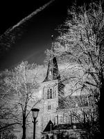 De Sint Lambertus kerk te Beers, Noord-Brabant. Deze foto is genomen met een aangepaste camera die alleen infrarood licht waarneemt. In de nabewerking is de infrarood opname teruggezet naar eenzwart wit opname. Deze omzetting geeft net een ander klerupatroon dan normaal zwart wit, de bomen worden bijvoorbeeld veel wityter. Het geeft licht vervreemdende en aparte sfeer aan een foto.