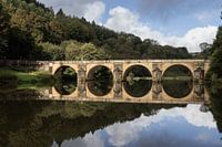 Het rustige water van de Semois in Chiny, België, vangt de prachtige weerspiegeling van de iconische Sint Nicolaasbrug. De boogbrug, omgeven door weelderige bossen, creëert een prachtig uitzicht met de brug weerspiegeld in het kalme water. Vastgelegd op een mooie stille ochtend in de vroege herfst, waarbij het landschap van de Ardennen er op zijn mooist uitziet.