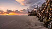 Idyllische zonsondergang in het Nationaal Park Waddenzee op het brede zandstrand bij Sankt-Peter-Ording in Sleeswijk-Holstein. De strandhuisjes en paalwoningen op het uitgestrekte zandstrand vormen een ideaal decor voor de romantische zonsondergang.