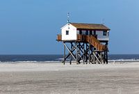 Een van de beroemde paalwoningen op het strand van St. Peter Ording aan de Noordzee.