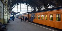 De feloranje Letse nachttrein van Sint-Petersburg naar Riga staat klaar voor vertrek in het imposante Vitebsky-station van de Russische stad Sint-Petersburg.