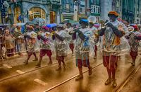 Het regende die dag in november 2014 tijdens de intocht van Sinterklaas in Amsterdam. Op de foto lopen op het Damrak de Zwarte Pieten dapper door en spelend op hun trompet vermaken ze jong en oud. De zwart geschminkte Pieten zijn in Nederland onderwerp van discussie. Sommigen willen de Piet niet meer zwart schminken, dit omdat de zwarte kleur zou verwijzen naar het slavenverleden van Nederland. De discussie verhit een paar keer per jaar de samenleving. Ondanks de regen word ik iedere keer weer vrolijk als ik het schouwspel zie. Ben er van overtuigd dat het ook u zal opvrolijken als de afbeelding bij u de wand siert!