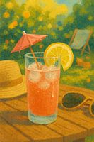 Sip of Sunshine vangt het ultieme zomergevoel in een kleurrijk, digitaal gouache kunstwerk. Op een houten tafel staat een verfrissend drankje met fonkelende ijsklontjes, een schijf sappige sinaasappel en een roze papieren parasolletje dat zachtjes lijkt te wiegen in de bries. Een strohoed en zonnebril liggen uitnodigend klaar, alsof ze zeggen: kom zitten, ontspan en geniet. Op de achtergrond straalt een zomertuin in volle bloei, met een ligstoel in het gras en een katje dat loom in de schaduw ligt te soezen.